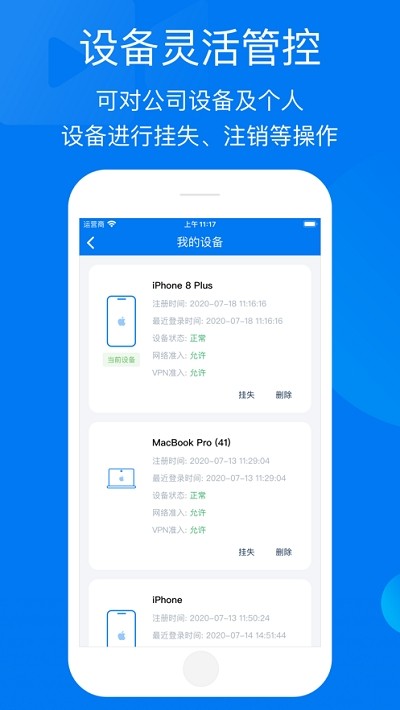 1、可信设备管理,可实现员工对自己名下设备的挂失、注册和注销,实现企业对办公终端的可视化管理;