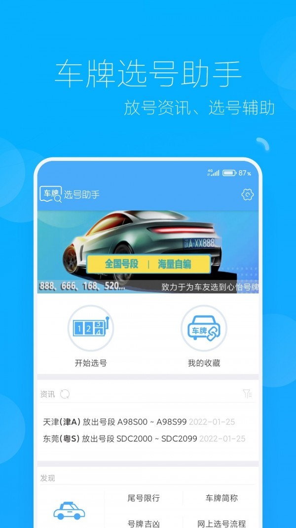 车牌选号助手是一款好用的汽车车牌选号应用工具,车牌选号助手为用户提供了全面的车牌选号功能,还提供更多车牌选取资讯,用户可以在这里尽情选取车牌号,更多优质的服务尽在车牌选号助手~