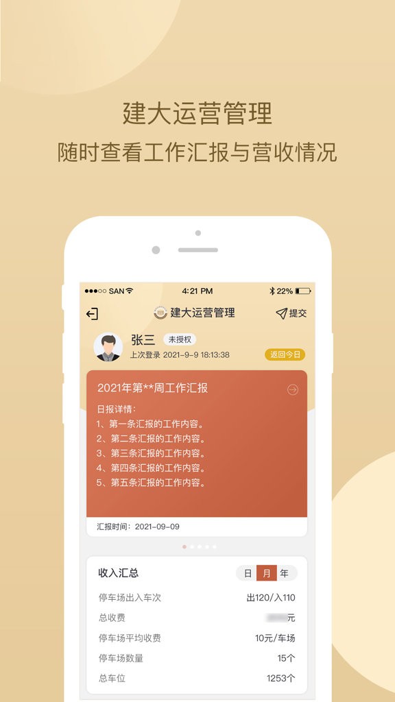 建大运营管理系统app是一款很专业的停车场服务管理的应用工具软件。这里有着超级全面的管理功能模块,可以有效的提高日常的办公效率。可以直接用手机在线查看停车场的实时情况。