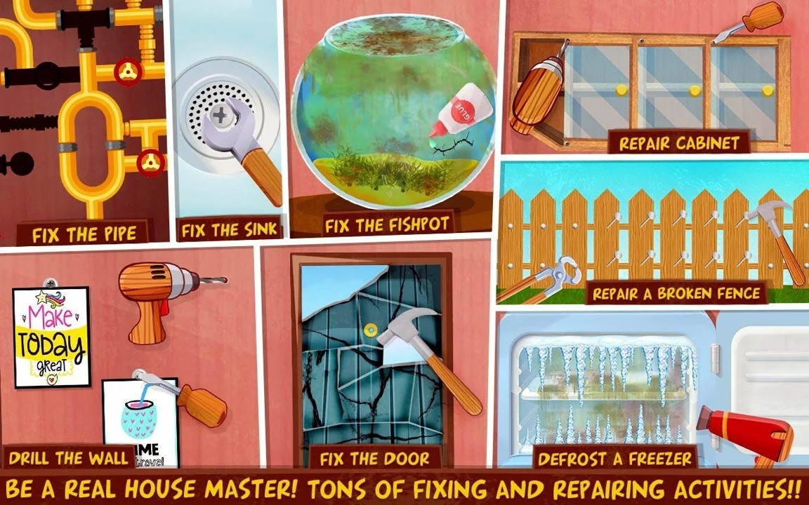 第二,修复和修复,在现实生活中,每个房间都挤满了许多维修活动。固定厨柜门,固定花园中的栅栏,通过解决难题来固定水管,固定门,用新鲜食物填充冰箱,在厨柜中添加一些食品杂货,安排厨房的所有厨房必需品,用冰淇淋和糖果填充冰箱,在卧室的墙壁上钻孔,就像真正的房主一样,你必须使用锤子和钉子,用螺丝刀和电钻固定。