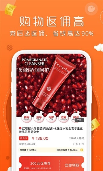 全网覆盖 千万某宝某猫某东隐藏优惠券等你来领 高惊喜返佣 佣金明显高于任何一家同类平台,百万福利惊喜海量更新 全民增收节支 0成本、0门槛、0风险,上班族、宝妈、大学生的增收节支首选神器