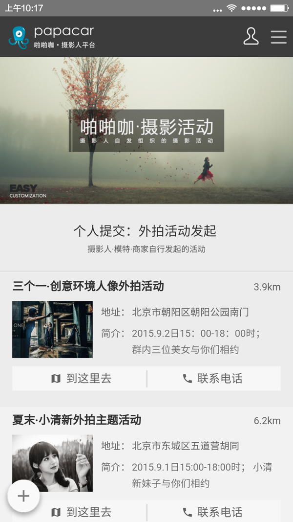啪啪咖摄影活动:发布平台为摄影人精心准备的外拍摄影活动,一键导航,精准定位活动地点。除此之外,我们还为摄影人、模特更或者是摄影商家提供发布活动的窗口,只要你有时间,你想拍。告诉大家吧
