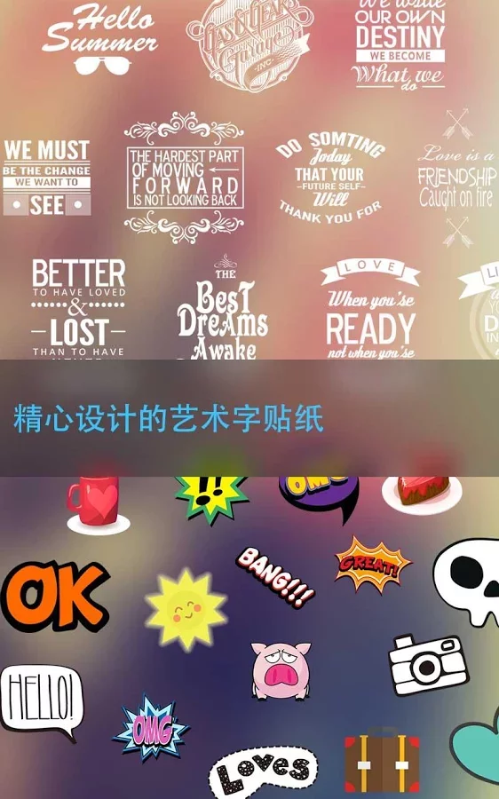 *你还可以翻转你的图形,做出更有创造性的图片设计艺术字贴纸400+的精心设计的免费贴纸,包括艺术字、图章、卡通等快捷分享到instagram、facebook等社交网络,为你获得更多的关注和赞叹。