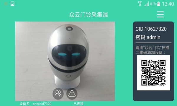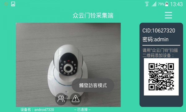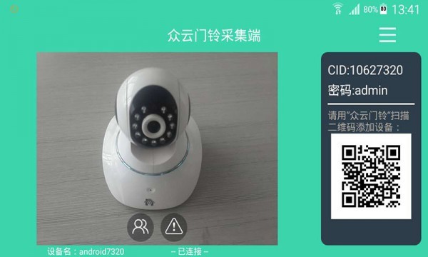 C. 开启“众云门铃”应用,可通过码扫“众云门铃采集端”二维码连接两端,也可以手动输入“众云门铃采集端”的CID号码和密码连接两端,即可观看实时视频和远程控制!