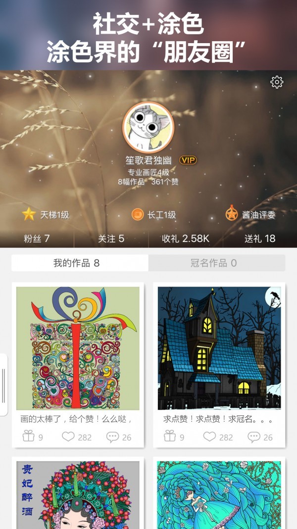 全世界酷的涂色手机游戏:涂色 社交媒体,涂色界的“微信朋友圈”。放松缓解压力、提高审美观、社交互动、娱乐休闲之家居旅行装备APP,为您出示的感受:数十个归类,数百张美图,每星期升级渐变色、纹路、明暗交界线、线框色,多种多样实际效果帮你造就的著作*共享、关心、关注、评价、私聊、送礼物...涂色交朋友都不耽误*各种各样比赛主题活动,丰富多彩奖赏。