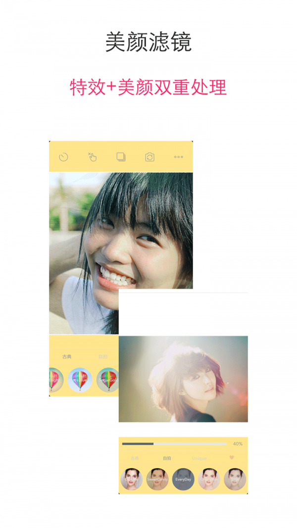 瘦脸瘦身、美白皮肤等,30 种精美美颜外框,40 种趣逗样子挑选,也有27 种太阳专题讲座随意应用!