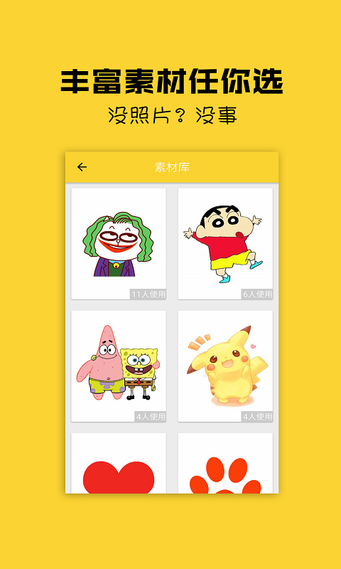 1、这里拥有海量趣味贴纸以及图片素材,自由搭配制作;