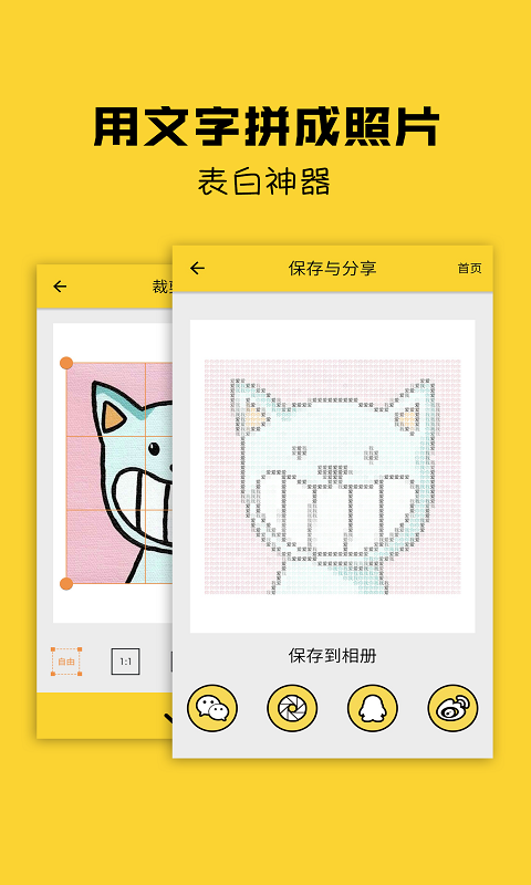 5、这里精选海量可爱素材,全都免费下载,大家可以自由拼接设置;文字拼成照片,让你的照片与甜言蜜语融合,带给心爱的TA一个惊喜的体验! 支持拍摄、相册裁剪照片,简单设置文字后即可生成照片,一键分享至朋友圈、微博! 如果你没有TA的照片?没关系,我们提供丰富的素材库,一样助你表白成功