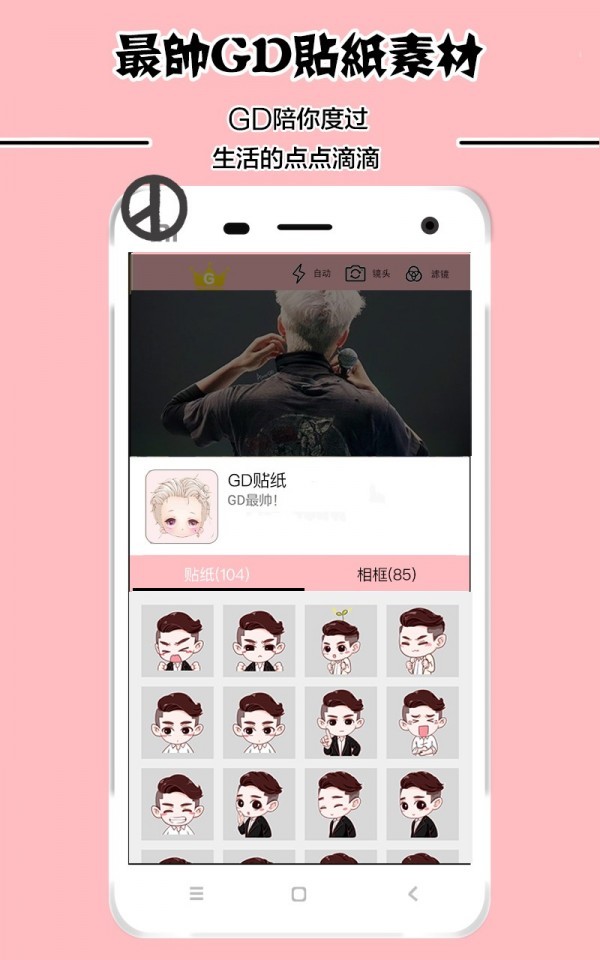 GD相机是一款权志龙粉丝主题的表情贴纸APP!供权志龙粉丝交流分享之用,所有贴纸素材均来自于权志龙粉丝分享以及同人创作。