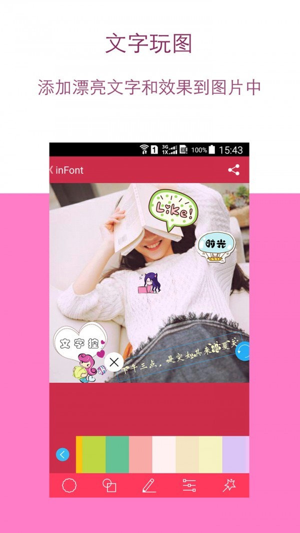 【文字玩图】可添加多个文本框,调节文字的颜色、透明度、阴影、间距等,可旋转、放大、缩小