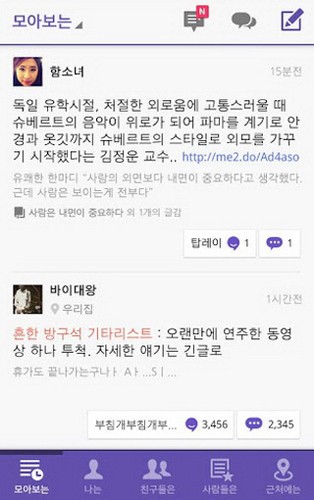 《me2day社区 me2day》是韩国Naver网旗下的一个类似中国新浪微博、等微博提供微型博客服务的网站。用户可以注册me2day,也可以使用naver网站的帐号登录。用户可以通过网页、WAP页面、手机短信/彩信发布消息或上传图片、视频和地图等。您可以将您看到的、听到的、想到的事情写成一句话,或发一张图片,通过电脑或者手机分享给好友。您的朋友可以第一时间看到你发表的信息,可以和您一起分享、讨论。您还可以加喜欢的名人或朋友,能即时看到他们发布的信息。
