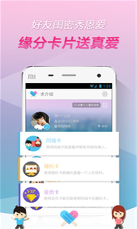 缘分卡片,给你送妹子。同城卡,在同城寻找缘分。随机卡,“送”你一个单身的她。