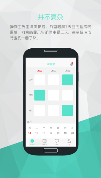 “谁有空”以时间轴表格为依托,手机通讯录好友为选择范围,方便快捷地规划未来七天的空闲时段。让你的空闲时间飞起来~真真正正做到“不约而同”。摆脱相约时的尴尬,解开无聊的枷锁,保护寂寞的隐私。并不是每个当下你们都会相遇,还好有空~