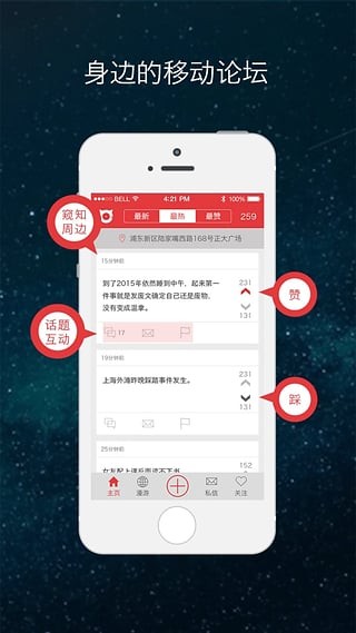 .浏览周围人们各种分享、话题,了解周边世界的新一面。