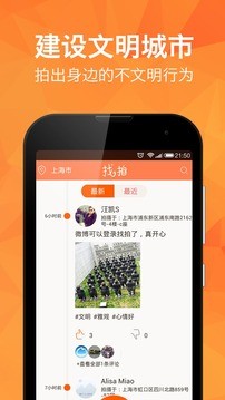 找拍是一款手机文明随手拍主题社交软件,生活中总会遇到这样或那样的不文明行为的人和事,现在有了找拍我就可以把他们的这个行为记录下来,发布到社群里大家一起谈论去曝光他们,让他们的丑行让世人都看见,文明和谐社会要靠大家一起维护,那么就从找拍开始吧。