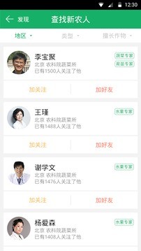 发现:根据地区、专业类型或擅长作物查找农人圈的农业能人,关注他们建立联系,咨询问题、活动商机