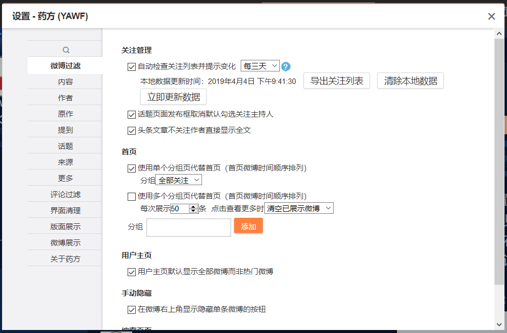 您可以在“微博过滤”选项卡根据需要调整展示哪些微博,此外可以切换到“微博过滤 - 更多”隐藏掉各类您不想看到的微博。“界面清理”、“版面展示”、“微博展示”三个选项卡提供了对页面绝大多数元素的清理和自定义功能。